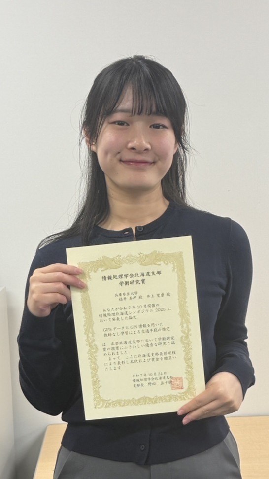 研究科修士2年生の福井美岬さんが2025年10月18日に行われた情報処理北海道シンポジウム2025において、情報処理学会北海道支部学術研究賞を受賞しました。いくつかの賞がある中で最優秀の賞であり、研究内容が高く評価されたものです。おめでとうございます。